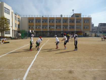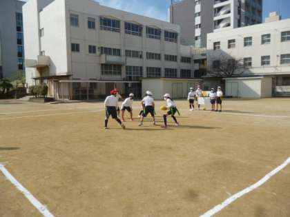 2組は運動場でフラッグフットボールをしています。何度かしているので、プレーの精度が少しずつうがってきました。