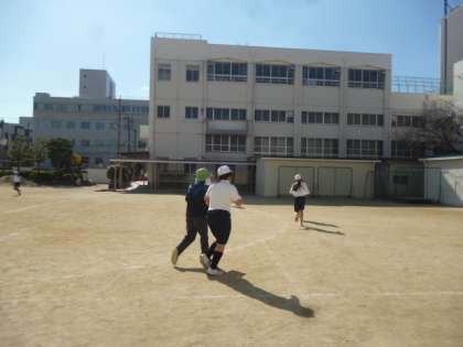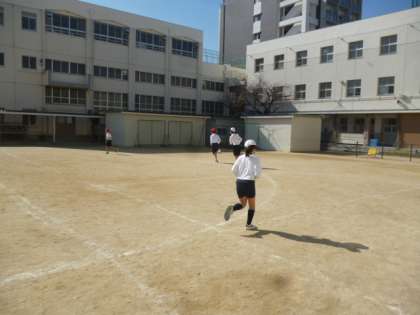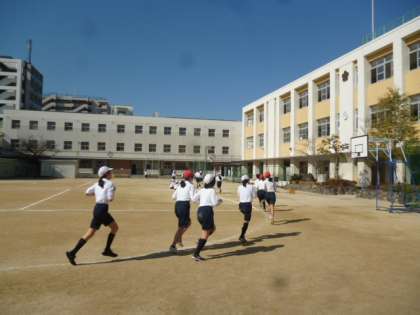 5分間走をしています。みんなしんどそうでしたが、最後まで一生懸命走りきることができました。中には10周以上、走っている人もいました。