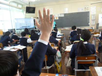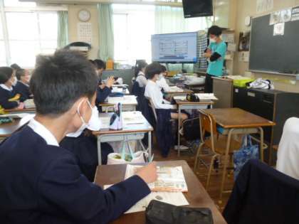 ものの値段を尋ねたり、答えたりする言い方について学習をしています。オレンジジュースが2円?「安すぎて行列できるで」とのやりとりに笑いが起きていました。