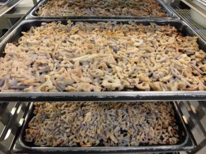 「焼きれんこん」は、塩と綿実油で下味をつけた冬野菜のれんこんを、焼き物機で焼きます。