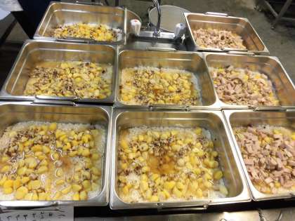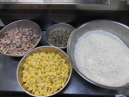「中華おこわ」は、もち米に焼き豚、くり、しいたけ、調味液を加え、焼き物機で蒸し焼きにします。チキンブイヨンとごま油でコクと旨味を出し 児童生徒に人気の一品です。