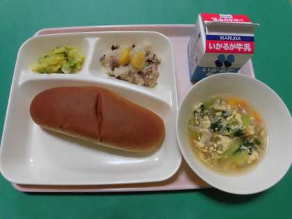 ★中華おこわ・卵スープ・キャベツとピーマンのいためもの・黒糖パン・牛乳