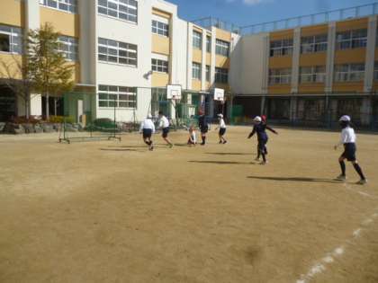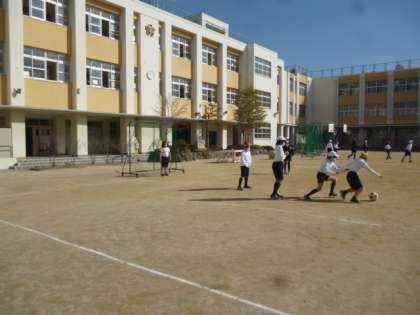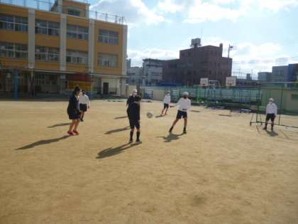 パス練習をした後に、攻撃側と守備側に分かれて、ミニゲームをしています。ゴールが大きかったので、ナイスシュートがたくさん見られました。