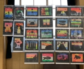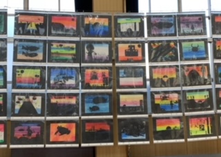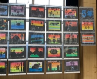 5年 平面作品「夕焼けの風景」「川の生き物」