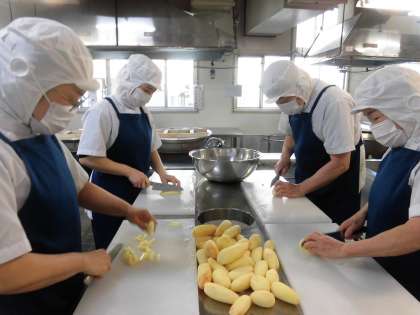 「豚肉のガーリック焼き」は、豚肉にワイン、塩、こしょう、ガーリック、こいくちしょうゆ、オリーブ油で下味をつけ、焼き物機で焼きます。ガーリックの風味がきいて子どもたちにも好評でした。ガーリック(にんにく)の写真を見て、1年生も「にんにくや!」とわっかっていましたょ。
