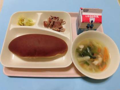 ★豚肉のガーリック焼き・スープ・サワーソテー・黒糖パン・牛乳