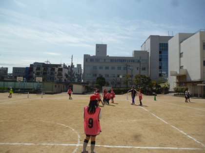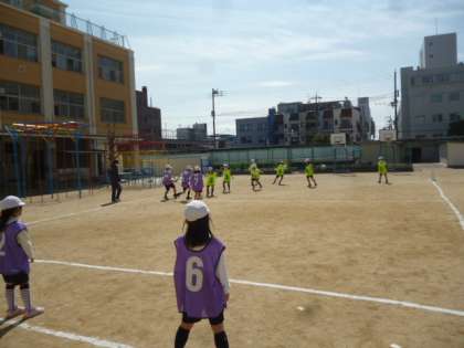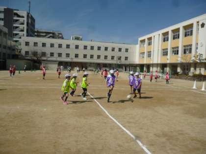 1組も2組も運動場でサッカーの簡単なルールの試合をしています。