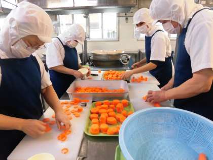 今、給食室前に掲示してある、6年生も含めた給食委員会児童が描いた「一番大好きな給食」は、約半数の児童が今日の「ラッキーにんじん入りのチキンカレー」です!