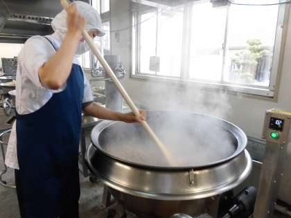 「さつまいものみそ汁」は、にぼしでだしをとっています。(1枚目の写真) さつまいも、はくさい、たまねぎ、しめじ、青みに青ねぎを使用したみそ汁です。甘みの出るさつまいもとたまねぎを使用しているので、赤みその割合の多い味つけになっています。
