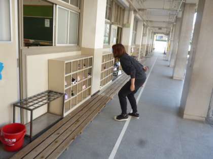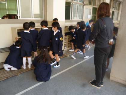 しっかりと先生のお話を聞くことができています。くつがきっちりとそろえられているか、確認してますよ。