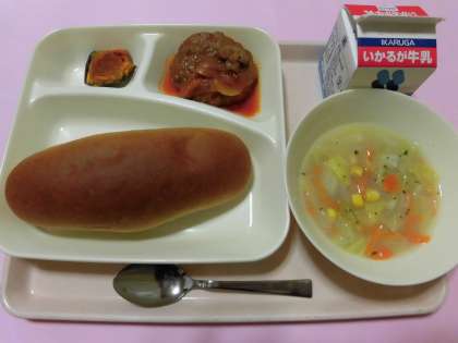 ・煮込みハンバーグ・コーンスープ・焼きかぼちゃ・黒糖パン・牛乳