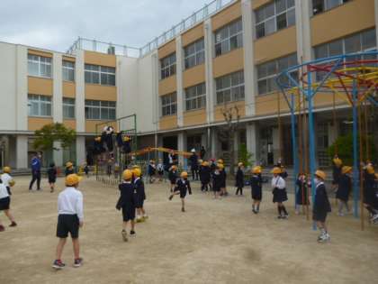 1年生は昨日、遊具の使い方を教えてもらったので、たくさんの人が運動場で遊んでいます。