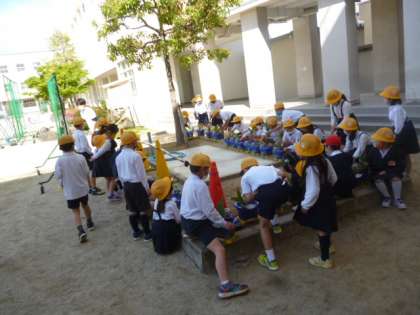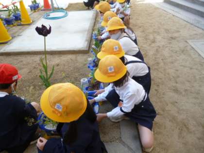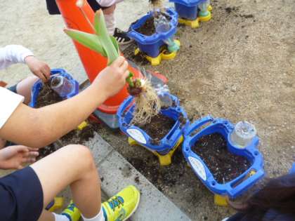 以前に植えたチューリップが随分と大きくなってきたので、移す作業をしました。もやしみたいな根を見て、大喜びでした。