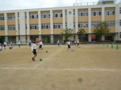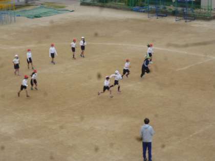 1組は運動場で、走ったり、ボールを使ってドリブルの練習をしたりしました。先生も一緒に走っています。