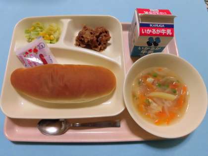 ・豚肉のデミグラスソース・スープ・キャベツとコーンのソテー・コッペパン・いちごジャム・牛乳です。