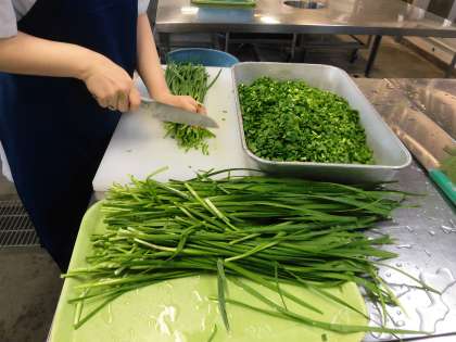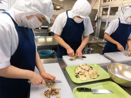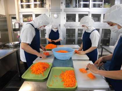 給食調理員さんは、毎日おいしい給食を作るために、たくさんの材料を切ります。だから、包丁使いの名人ぞろいです。