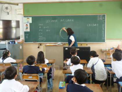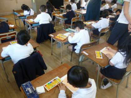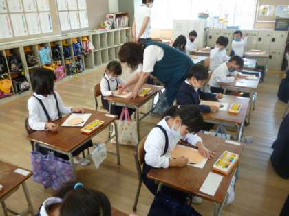 じぶんのかおの色塗りの続きをしています。「かみのけをくふうしてかこう」を意識しながら、描いています。きれいな絵に仕上がっている人が多かったです。