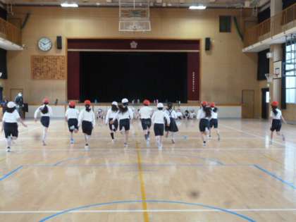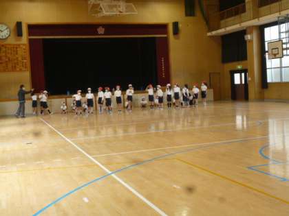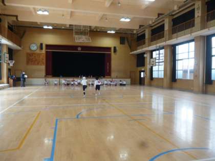 1組は体育館で20mシャトルランをしています。一番多い回数の人は40回を超えていました。すごいね!
