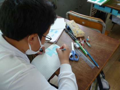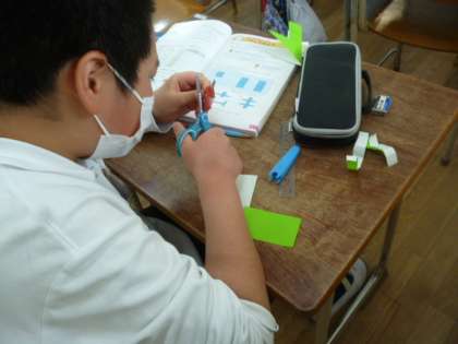 「線対称」の図形を実際に折り紙を使って、つくってみました。重ねて切ると、ちゃんと線対称の図形になっていました!