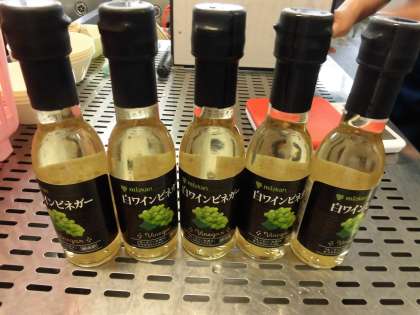 2枚目の写真はワインビネガーです。ぶどうから作るお酢のことです。給食では、白ワインビネガーを使っているので、フルーティな香りがあります。