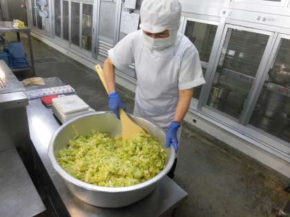 今日の給食では、キャベツを蒸して、砂糖、塩、ワインビネガー、うすくちしょうゆで味つけしています。