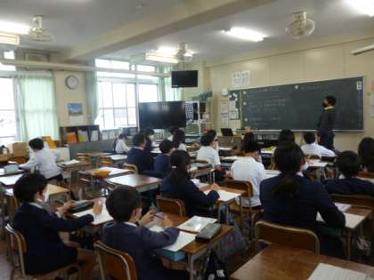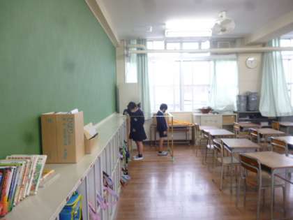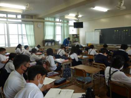 算数の授業をしています。体積の求め方について学習をしています。教室の後ろには定規で作った1mの立方体があり、実際の大きさの感覚がわかりやすくなっていました。