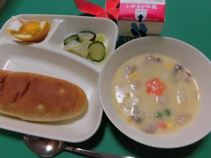 今日の給食は、コーンクリームシチュー・キャベツときゅうりのサラダ・かわちばんかん・おさつぱん・牛乳 です。