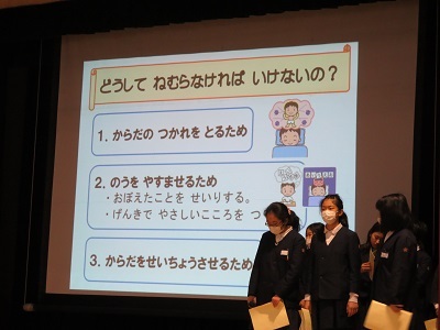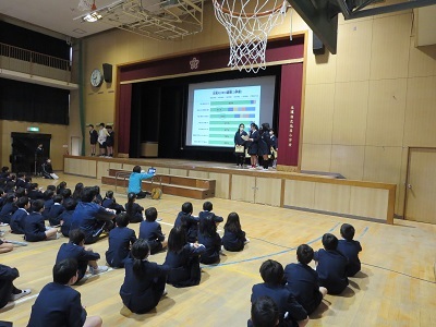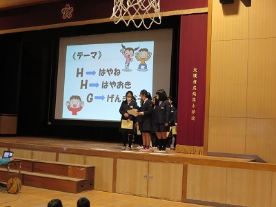5日(木)の児童集会で、健康委員会から一年間の活動のまとめの発表が