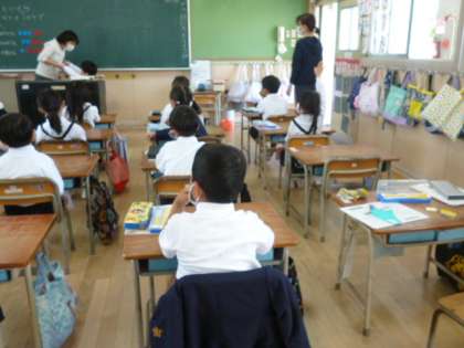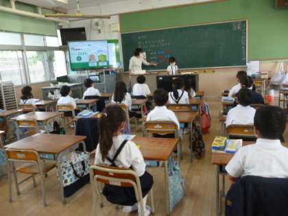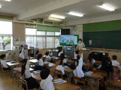 1組は算数で、いくつといくつをおはじきを使って、学習しています。みんな積極的に意見を発表していました。