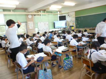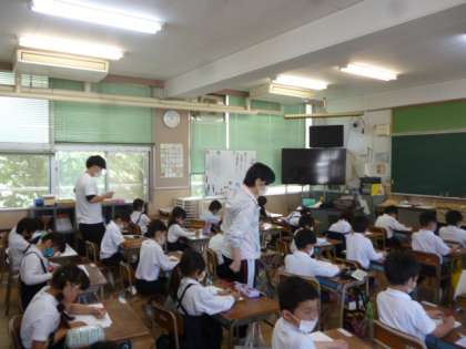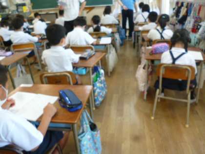 算数のドリルの答え合わせをしています。たくさん問題を解いていこうね。