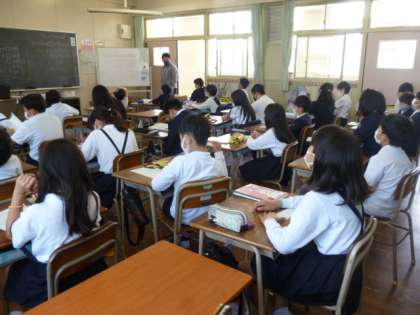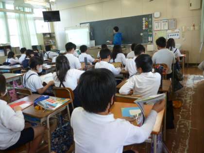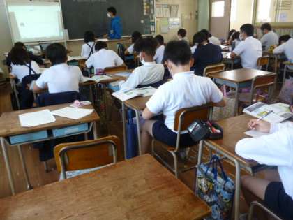 2組は社会、「日本の国土」について学習をしています。1組は算数、立体図形についての学習をしています。