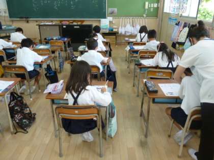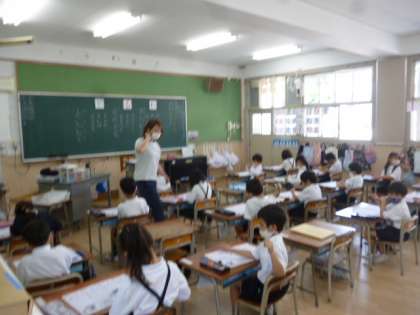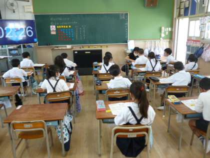 1組は算数、「6」をいくつといくつに分けるかを学習しています。2組は国語、「わ」「る」「と」のひらがなを丁寧に書いています。