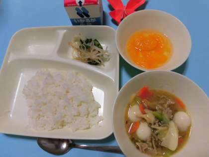 ・八宝菜・チンゲンサイともやしのしょうがあえ・みかん(缶)