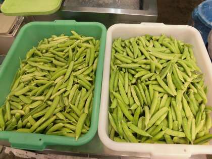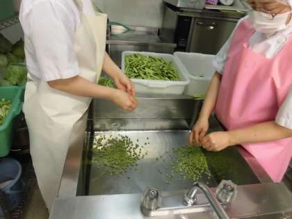 朝早くから、給食調理員さんが4人がかりで、2時間近くかかってさやむきをしてくださいました。