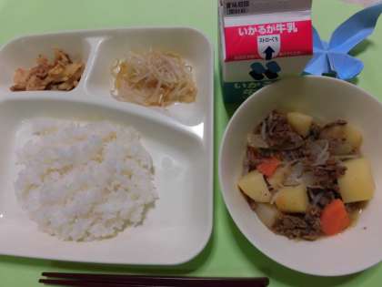 ・肉じゃが・もやしのゆずの香あえ・ごまかかいため・ご飯・牛乳 です。