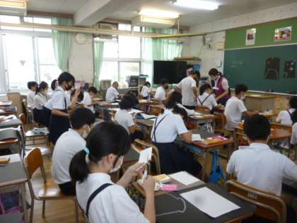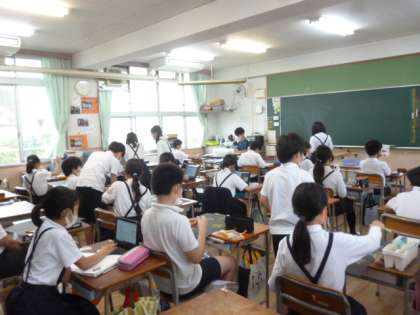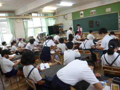 今日から、全学年、1時間目から4時間目まで、通常授業です。(来週月曜日からは午後も通常授業になります。)1時間目から教室が賑やかでした。6年生は黒い画用紙に壺と花の絵を描いています