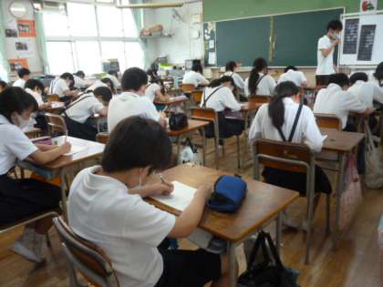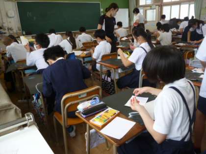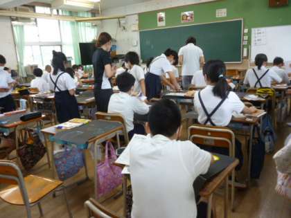 1組は漢字テストです。テストの直前までしっかりと復習をしていました。2組は昨日の続きの、壺と花の絵を描いています。