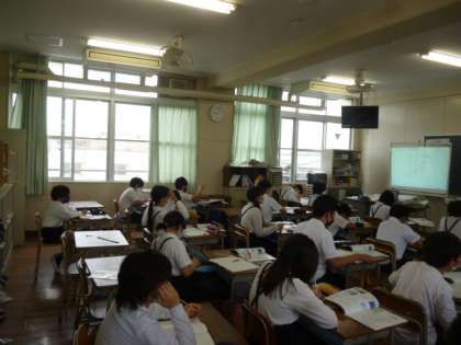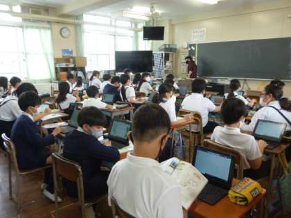 2組は大阪の河川や山について学習をしています。1組はその範囲のテストを今からするところです。ぎりぎりまで、教科書とタブレットで復習をしています。