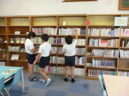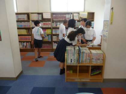 6年生は図書室で、読書の時間に読む本を選んでいます。今は梅雨なので、たくさん本を読むチャンスです。たくさん読もうね。