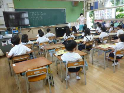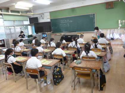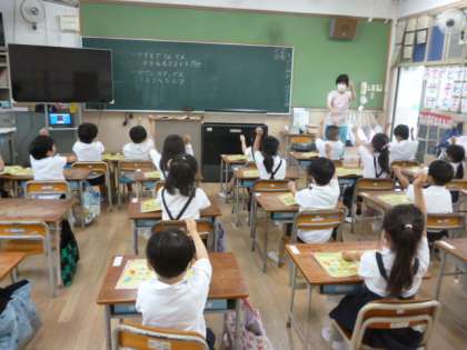 今日から1年生も午後からの授業です。がんばっていきましょう!「セブンステップス」を手ぶり身振りを交えながら、元気に歌っています。