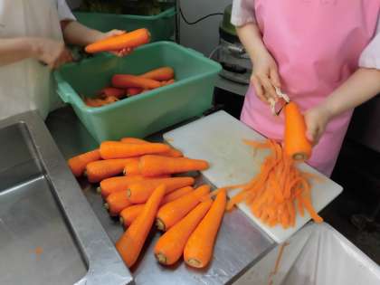 1枚目の写真は、今日の給食に使うにんじんの皮をむいているところです。