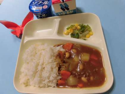・牛肉と大豆のカレーライス・レタスとコーンのサラダ・ヨーグルト・牛乳 です。