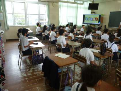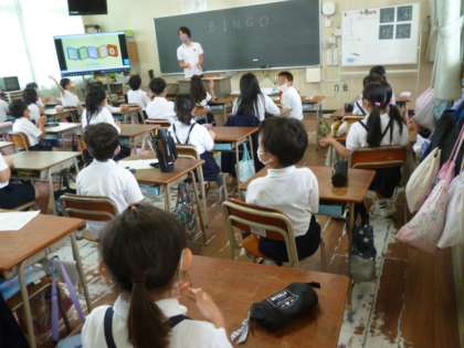 1組は日直さんが前に出てきて、先生と一緒に今日の目標と一日のスケジュールを確認しています。2組は英語でBINGOをしています。