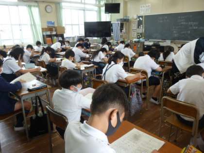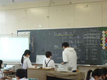1組は理科で植物についてのテストをしています。2組は英語です。「何がすきですか?」をグループで話し合っています。