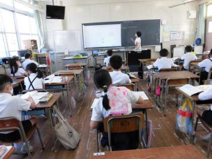 1組は2つのグループに分かれて、割り算の仕方について、昨日と違う問題に取り組んでいます。2組は国語のテストの前に自分で勉強しています。