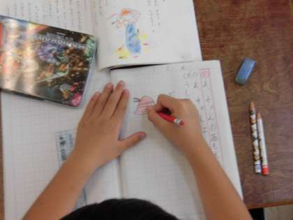 今日は国語「なまえをみてちょうだい」から主人公がかぶっていた赤い帽子をイメージして、それぞれが考えて書いています。きれいな帽子ができたかな?