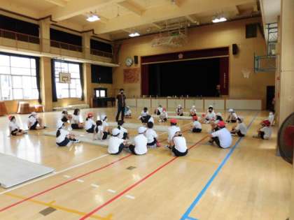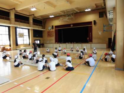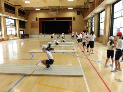1組は体育館でマット運動をしています。前転はうまくいきましたが、後転はなかなか苦戦しているようです。きれいにできている人がみんなの見本になって、技を披露してくれています!