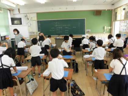 1組は国語「さとうとしお」について学習をしています。甘いものやからいものなど、砂糖や塩が使われているものをどんどん発表してくれました。2組は今日はねんどで「ごちそうをつくろう」ということで、今日もねんどを柔らかくするために、力をこめてこねています。