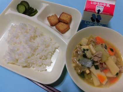 ・中華煮・あつあげのピり辛じょうゆかけ・きゅうりの中華あえ・ご飯・牛乳 です。