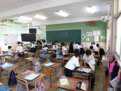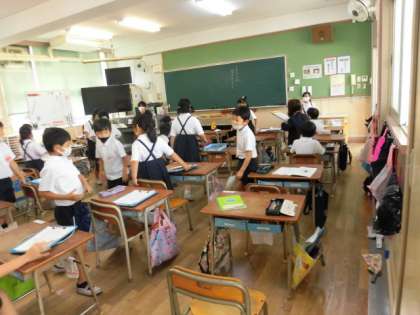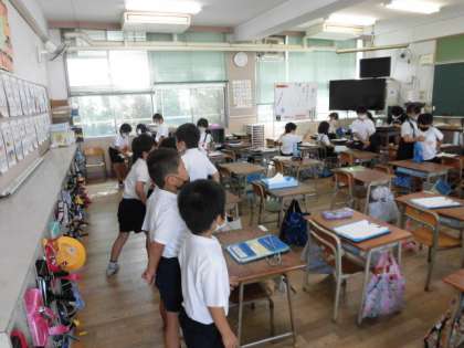 今日の「学校たんけん」に向けて、練習をしています。1年生のこと頼みますよ、2年生!